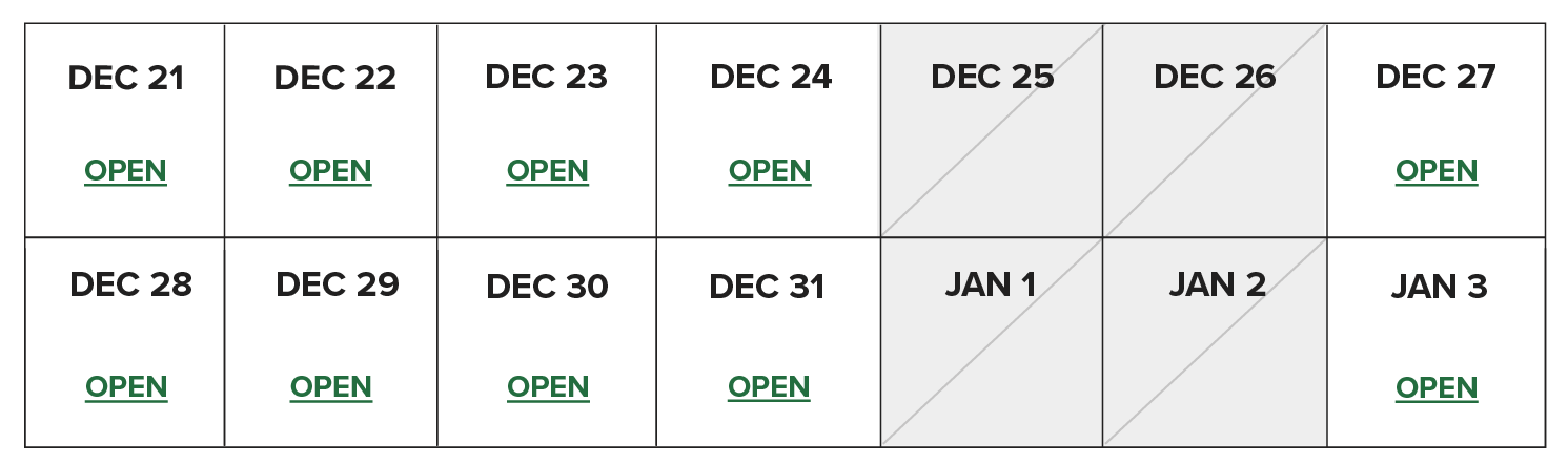 CLOSED EVERY MONDAY & TUESDAY. SEE HOLIDAY SCHEDULE FOR EXCEPTIONS